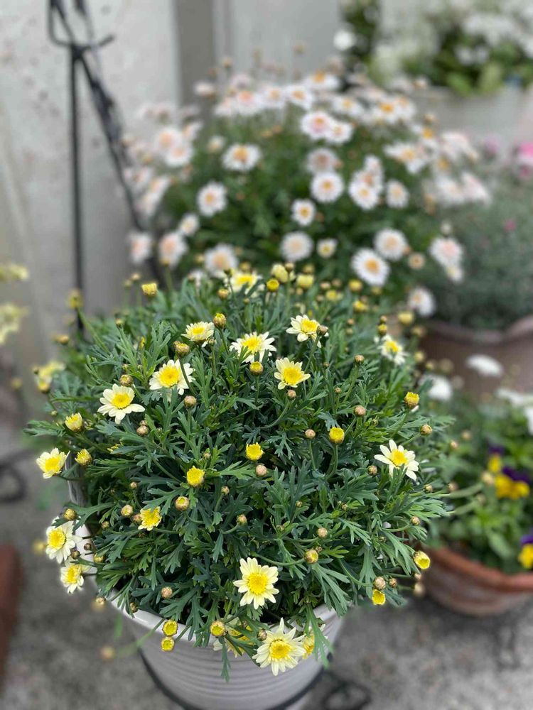 こちらも昨日撮ったボンザマーガレットのレモンイエローさん。昨年11月にお迎えしたもの。やっと可愛いお花が咲いてきました🌼奥は先日upしたイチゴショート。レモンイエローが満開になる前にイチゴショートは切り戻しかなぁ☺️