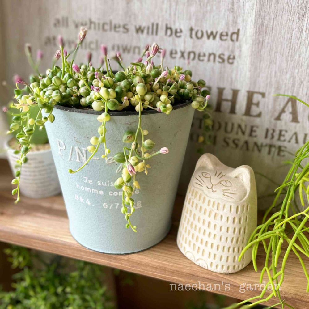 このかわいい、斑入りグリーンネックレスを見てやってくださ~い(*≧∀≦*)先週、園芸店で見かけて難しい子だから、どうしようσ( -ˇ.ˇ-。)ウーンと迷いに迷って.........お迎えしちゃいました(^_^;)置物のネコちゃんも斑入りのグリネをキレイだなぁって見てると思います🎶¨̮