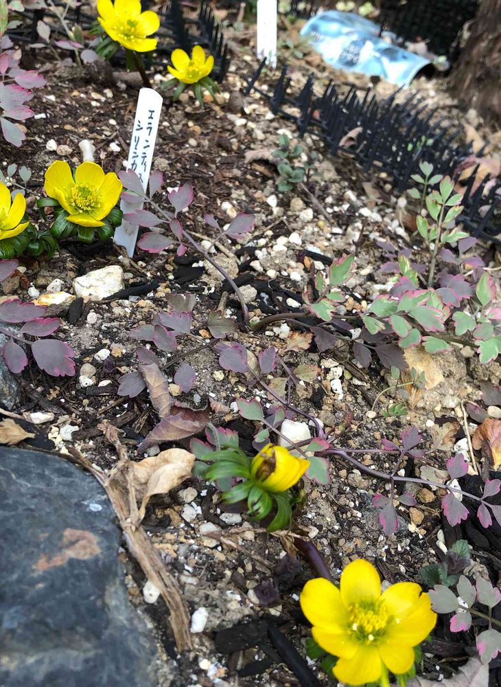 こんにちは😊寒いですね😨2週間ほど前の写真です🤳寒い時期にいち早く咲くセイヨウセツブンソウ🌼ピンクの葉っぱはセリ フラミンゴ🦩私の花壇で爆発的に増えてます😱