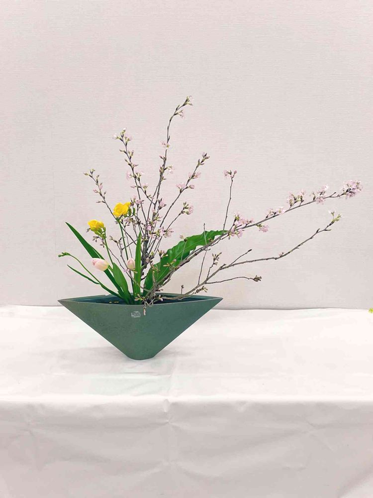 花材が春の花づくしで何だか嬉しくなって生けたら先生が「よし、桜全部使ってこれでもかー‼️くらい生けちゃいなさい‼️」と、手直しの時、更に追加していただきました🌸😄