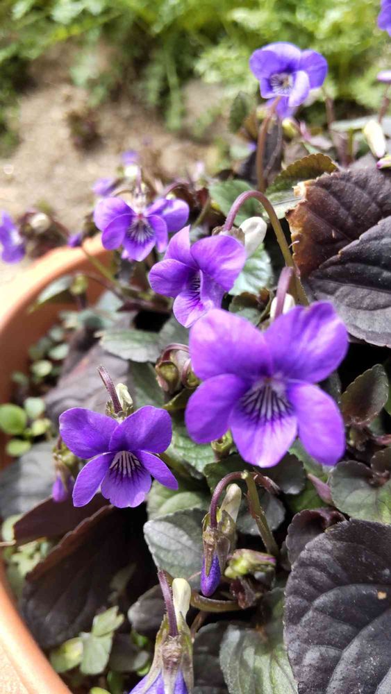 濃い紫色の花びらで黒い葉のスミレさんとても素敵です、スミレ大好きです🥰