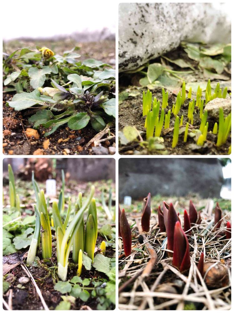水仙もチューリップもなんだか分からない芽も、雪解けが始まるやいなや天に向かってツンツン伸び始めました