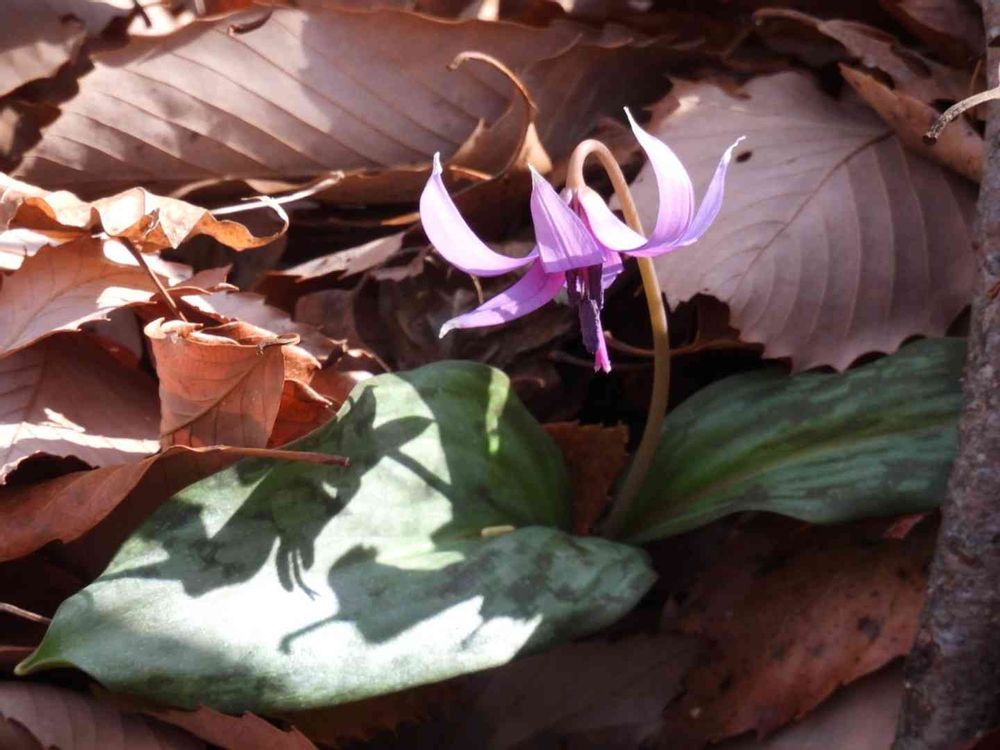 降り積もった枯れ葉の中からカタクリの可憐な花が木立越しに射す春の陽を浴びて、恥じらうように俯いて淡い紅のさした姿を現していました。