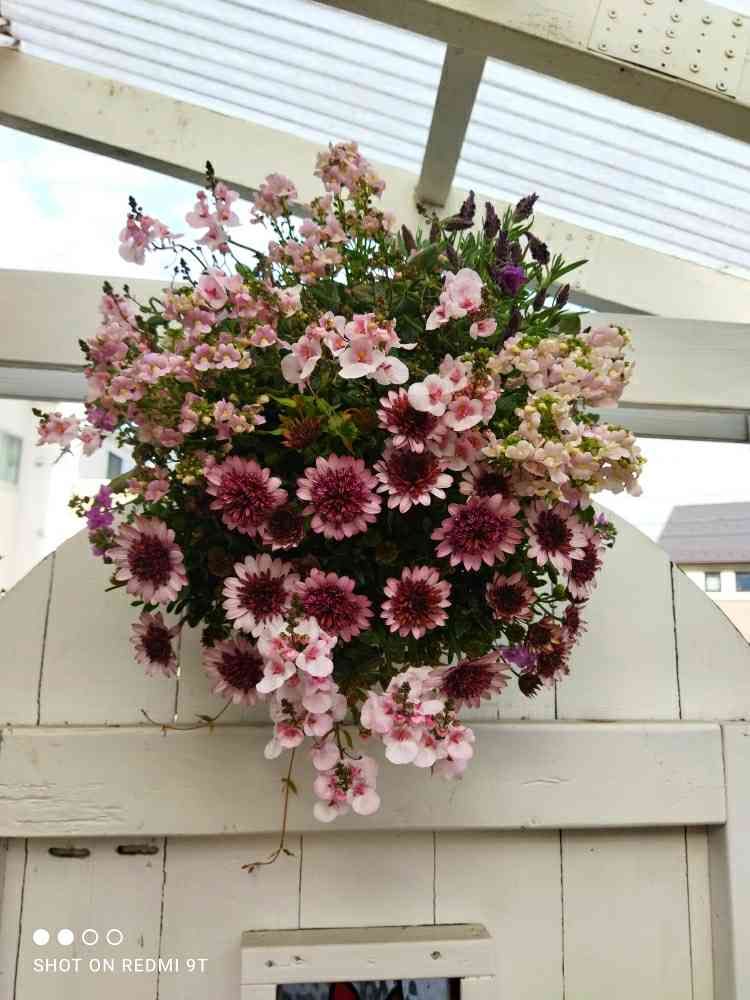 スリットバスケットの寄植え、丸くなるように植えていくので、そこだけお花の集合体🌼