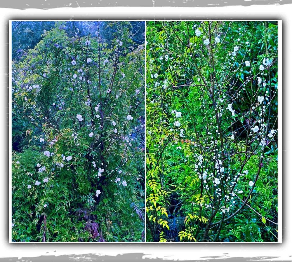 どちらも元は同じ木なのデスが、それぞれ羽衣ジャスミンの枝蔓でいっばい覆われているので、一見の見ようによっては別な木が2本あるようにも見られますデス🐶