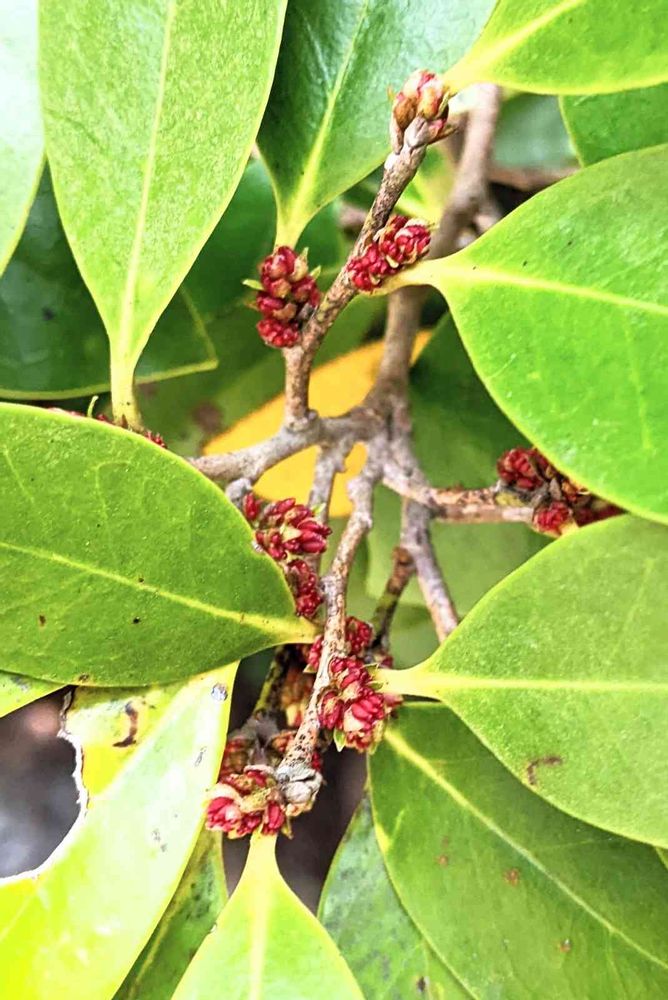 初めてみた、赤い花が咲く大きな木で、虫こぶが付くことで有名な木のようです💕