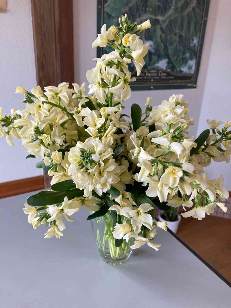 ストックが満開になり、切花組で植えた子たちのプランターからはみ出した枝をもらって飾ってみました。いい香りがします♪