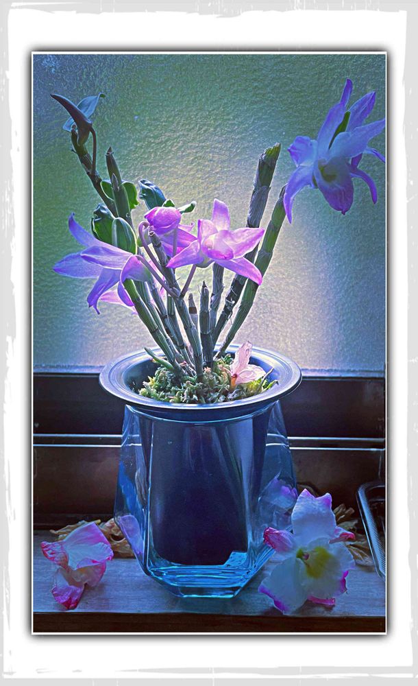 更に、鉢を入れたガラス容器の両脇には、デンドロビウムの花が落下したものを置いて写真を撮ってみましたデス🐶