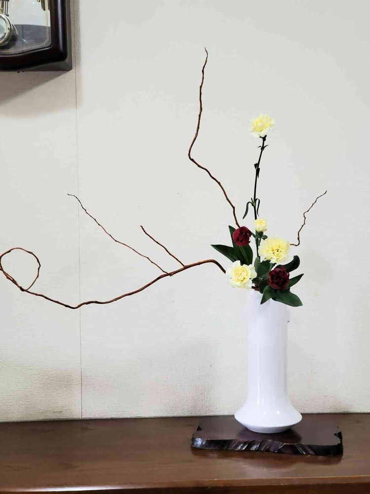 後のカーネーションがやや高い、とのことですが、私はこのままがベストだと思います。下げてしまうと、まとまりすぎて伸びが小さくなるのでは?偉そうなことを言ってごめんなさい🙇