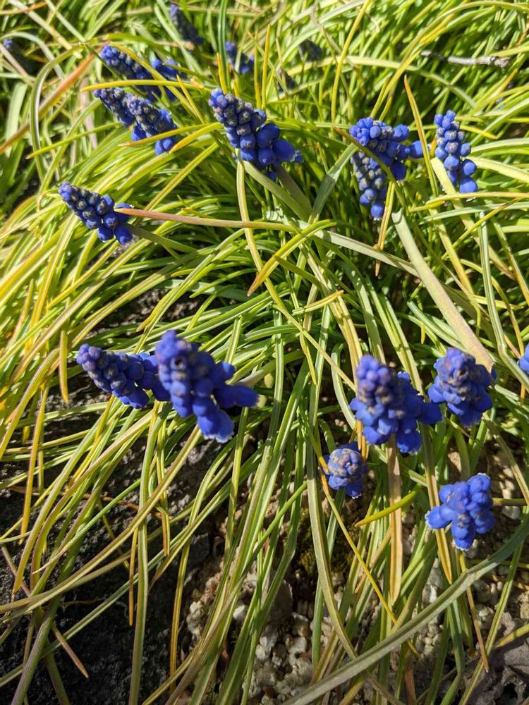 民家の庭先の花壇でニョキニョキと咲き出した💙ムスカリ💙