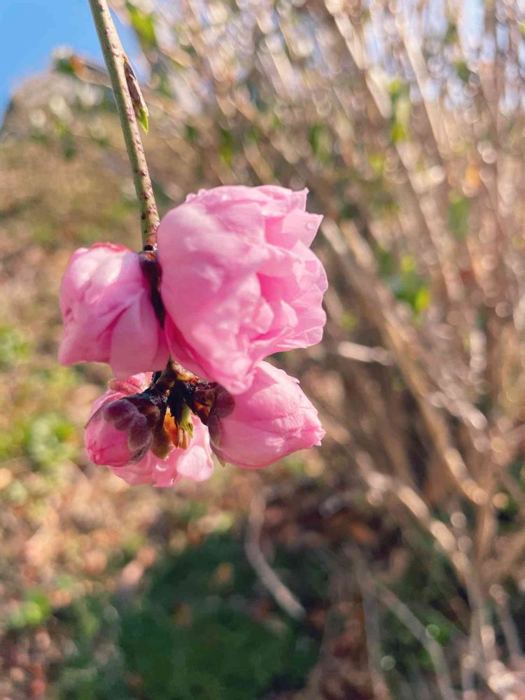 ふと、庭先を見ると、枝垂れ桃が、蕾を持って、少し花🌸開きました