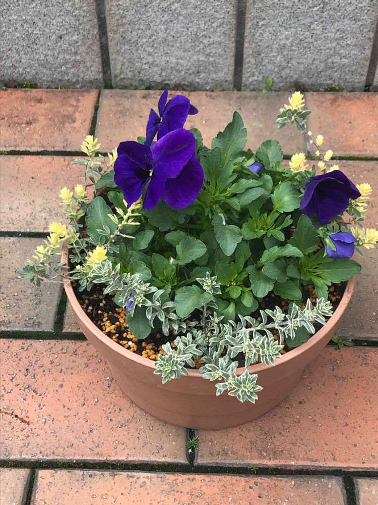 種から蒔いたよく咲くスミレ、叔母の家に来ているヘルパーさんに寄せ植えをしてプレゼントしたら、とても喜んで頂きました。