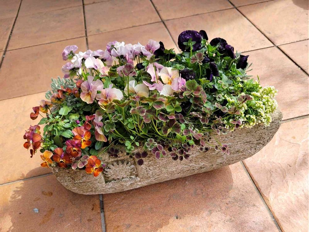 冬の間、赤紫になっていたビオラ コリーナ テラコッタはレンガ色に、夕焼け色だったノンブランドビオラは淡いピンクに、エンジェルグローバー チョコレートは黒みがぬけて丈が伸びています
