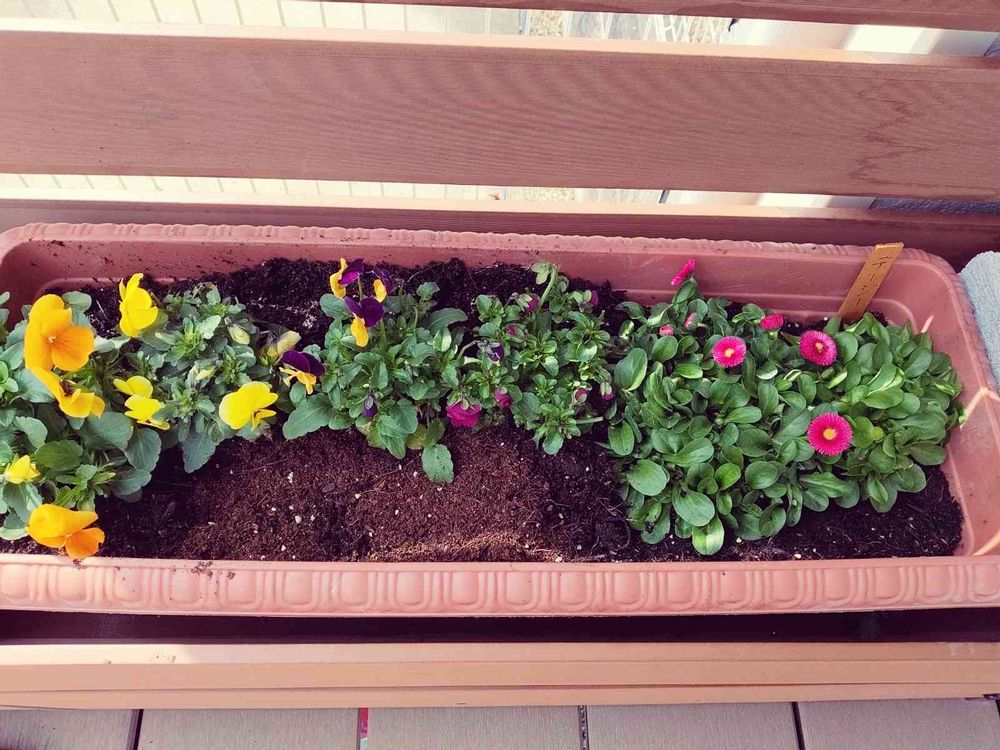 こんにちは。春で暖かくなってきました。ウッドデッキの長細プランターにビオラを植え付けしました。ビオラ8コで600円くらいだったと思います。モリモリにしたいです。よろしければご覧ください。