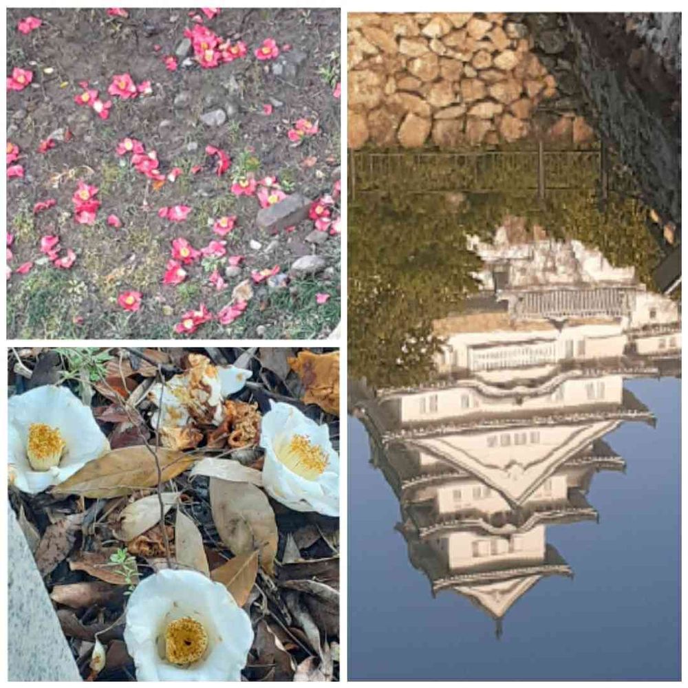 落ちたツバキも水面の姫路城も綺麗だなー😍💓💓