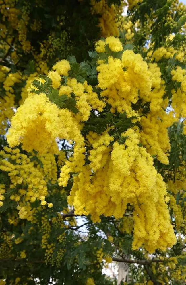 マメ科アカシア属の常緑小高木。オーストラリア南東部原産で明治時代末期に渡来した。庭木として植えられる。銀色っぽい小葉からなる偶数羽状複葉が螺旋状につき、遠くから見ると青白く見える。花期は2~4月。黄金色の花が集まって球形になった花がさらに房状になって木全体を覆う。豆果は長さ7㎝前後で赤褐色。