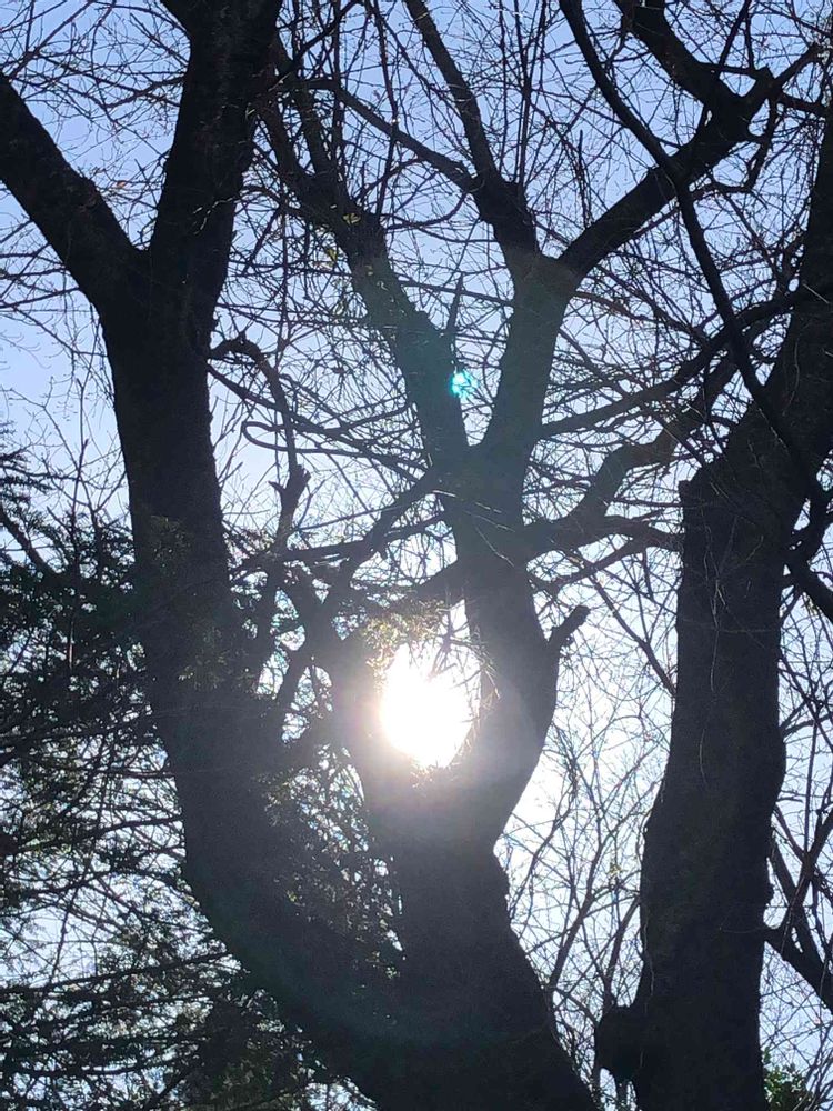 ちょうど、木の幹の分岐点からお日様が顔を覗かせて綺麗ですね🥰
