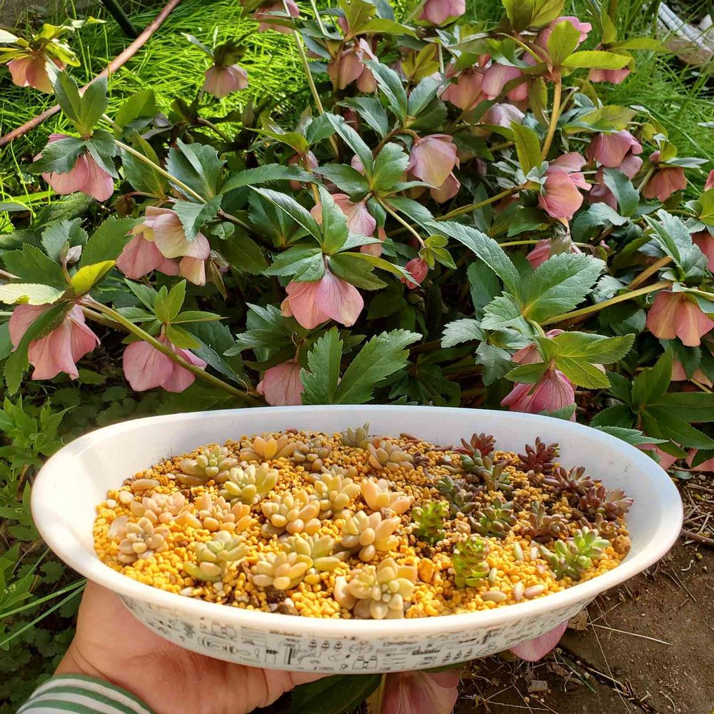 メル狩っ子の姫秀麗とセダムをダイソーのプラスチックカレー皿に植えてみた