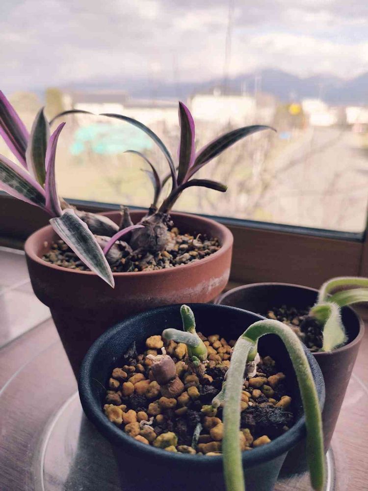 春が近づくと、自分のなかでアツくなる球根系。こちらは絶賛見守り中のお三方(手前は多肉)。