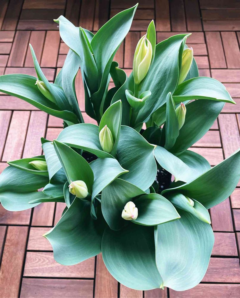 1ガロンのフェルト鉢に「超特大球」のチューリップを10球をギュウ詰めしたものです。葉も茂ってきて、蕾も上がってきました♪