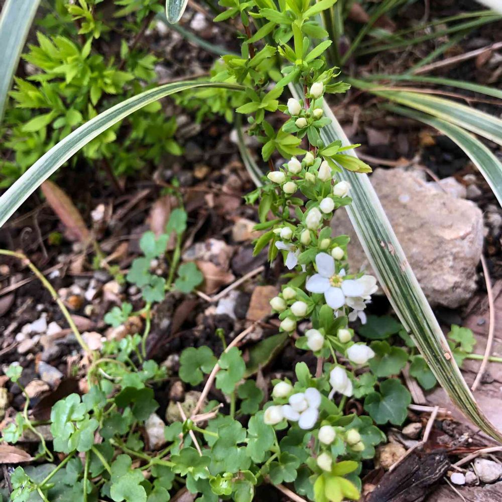 シェード小道に植えているまだ小さな、黄金葉ユキヤナギ少しだけ咲いてます♪可愛い😍