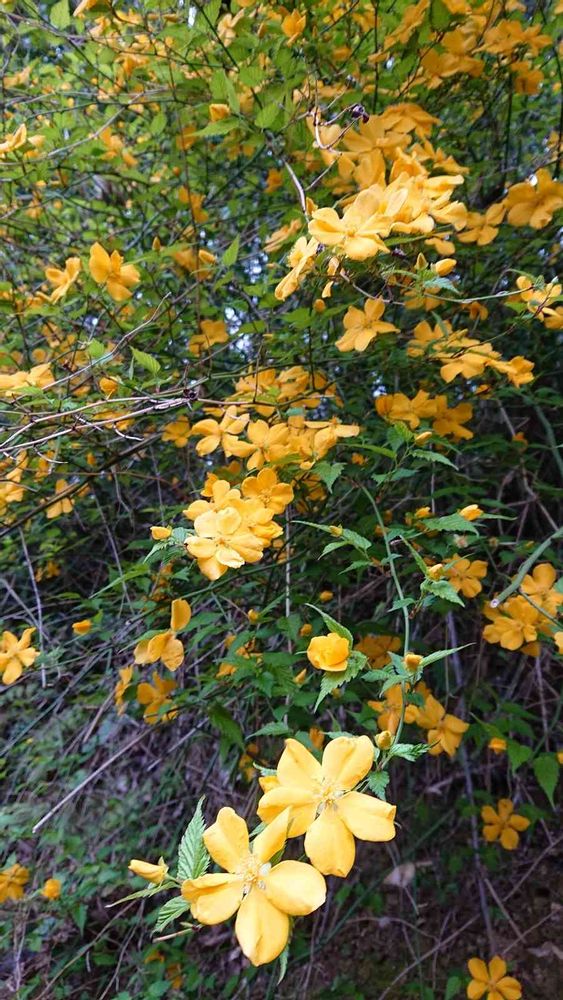やはり花は茎と葉もとても重要なので、私は皆さまに聞く時、全体を撮るようにしてます。花だけだと時期的に黄梅に似てるなぁ〜と思ったけど、葉っぱがギザギザだったので山吹だと分かりました♪😊🧡