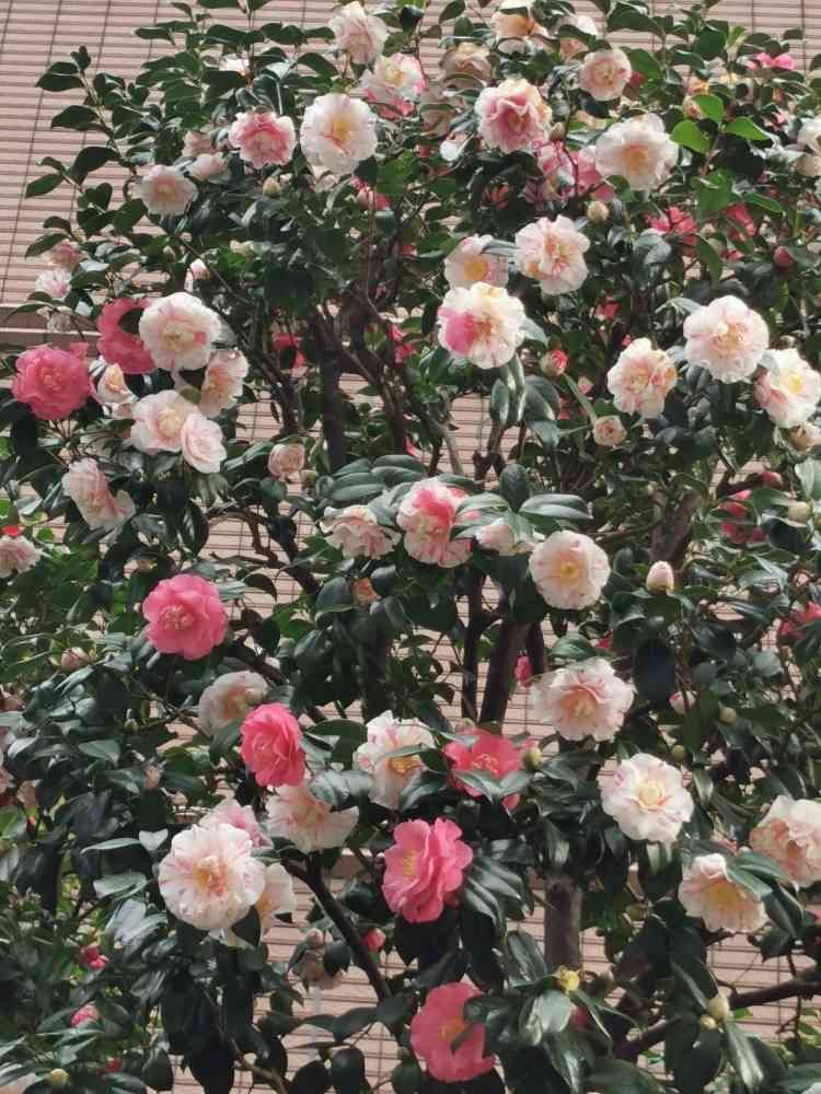 1本の木に、違う色の椿が、見事に満開に咲いて、綺麗ですね〜