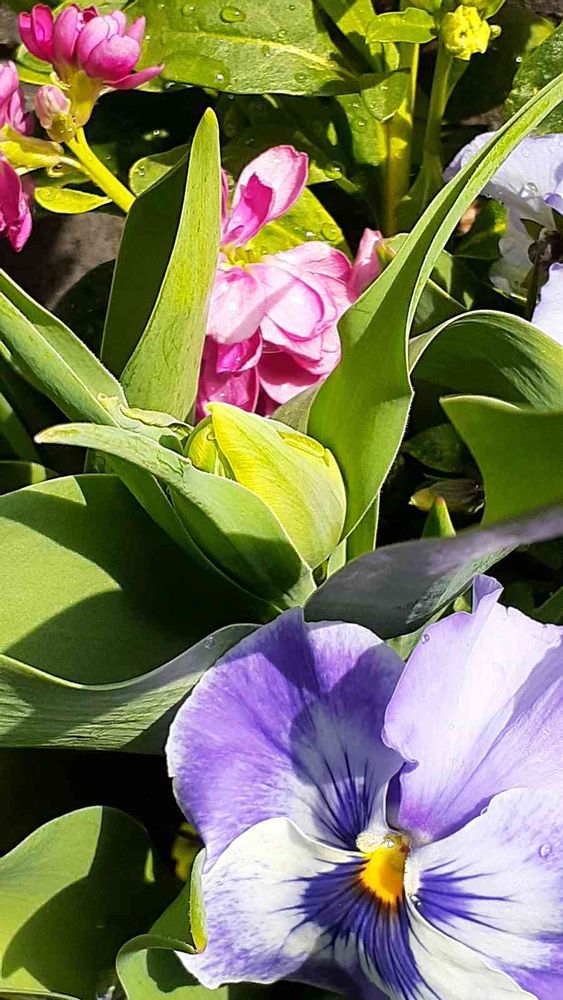 ストックとパンジーに挟まれたチューリップさん🌷