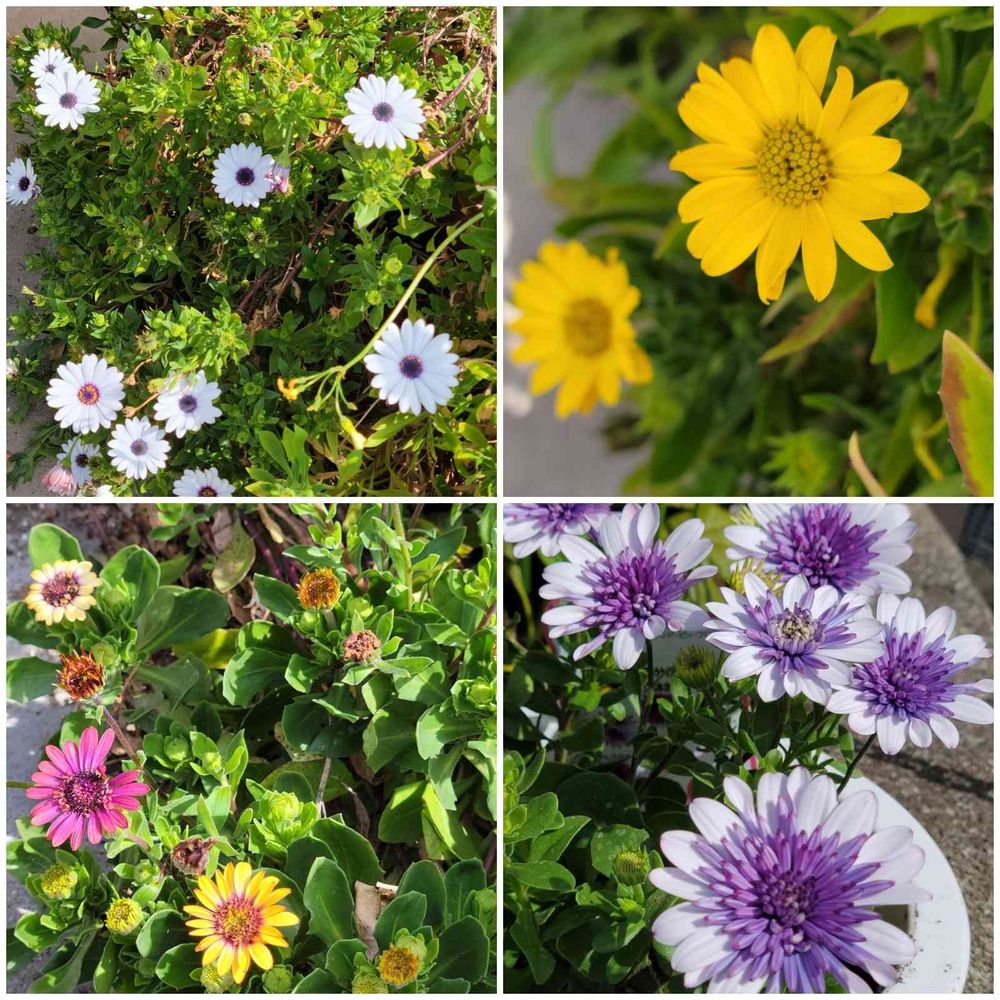 ガレージで咲いてるオステオスペルマム、右下紫💜は昨日仲間入り!❣