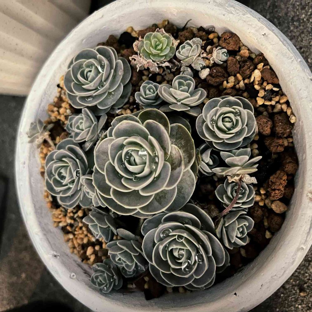 実際は10センチくらいの素焼き鉢なんですが、見るたびにしっかりとしたロゼット型になってます!