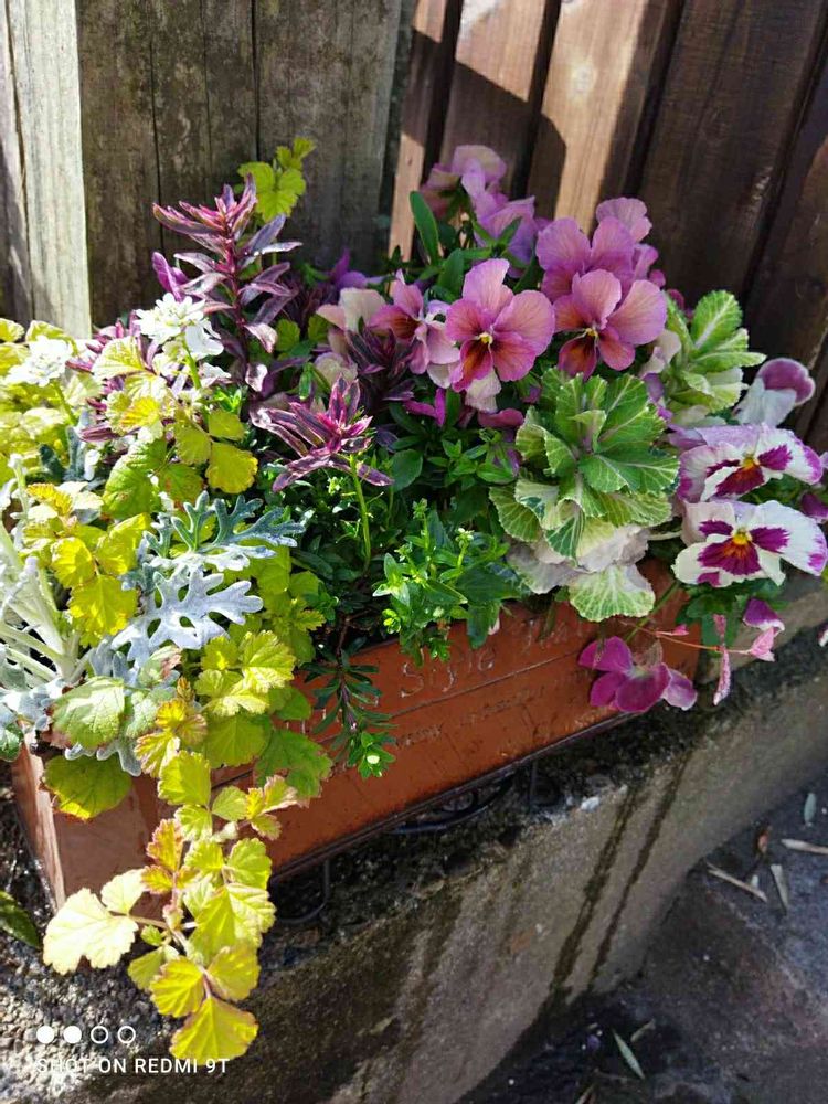 スリットバスケットの寄植えを解体して、ブリキ鉢に寄せ集めました💮