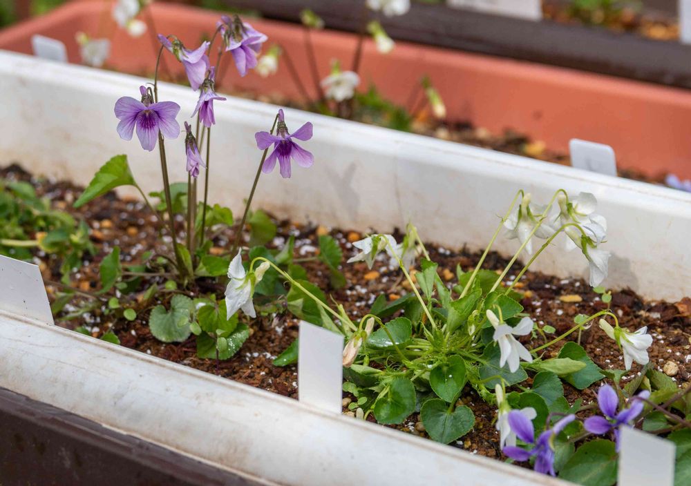 サクラタチツボスミレ(桃花)とシロバナタチツボスミレ。どちらもタチツボスミレの色変わり。