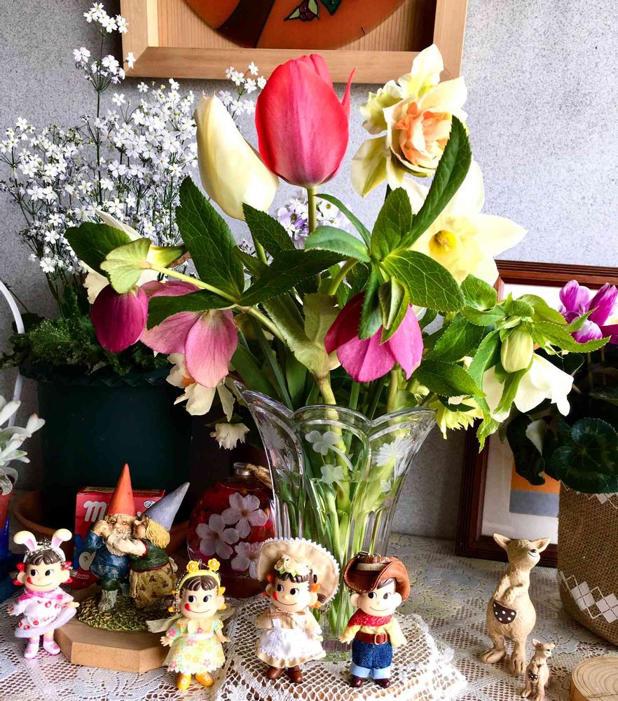 我が家の玄関にはペコちゃんポコちゃんとクリスマスローズさんとチューリップ🌷🌷さんが一緒にいます。