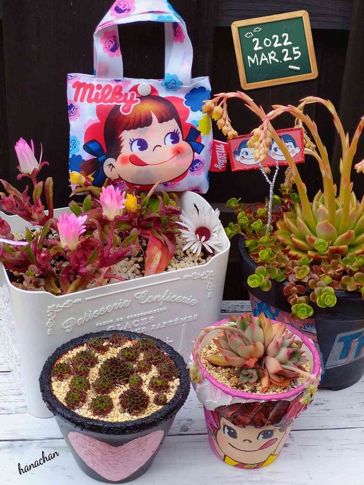黒に♡のリメ鉢よーチャン ペコちゃんポコちゃんピックもよーチャン💖
