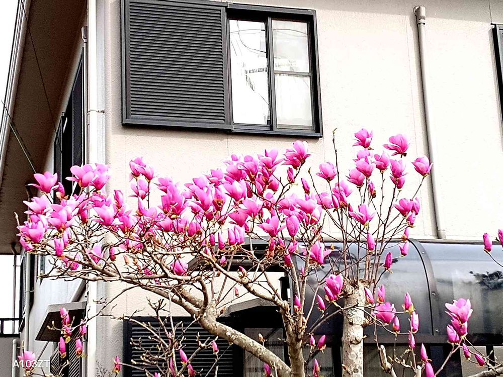 お出かけ先,赤いモクレン,通り道のお宅の投稿画像