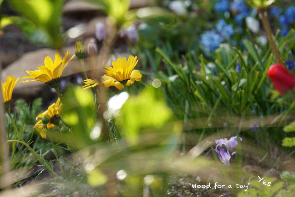 側ではニゲラやカンパニュラ、チューリップの葉が立ち上がり、向こう側ではブルーや白のシラーやプスキニアが賑やかに踊り