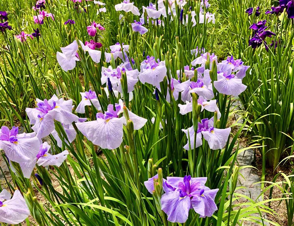 ハナショウブは初夏、梅雨の中でも、ひときわ華やかに咲き誇ります。野生のノハナショウブをもとに、江戸時代を中心に数多くの品種が育成され、現在2000以上あるといわれています。優美な花形としっとりとした風情が魅力で、色彩の魔術師とも呼ばれるように、花色の変化に富んでいます。アヤメやカキツバタに似ていますが、花弁のつけ根が黄色で、アヤメのような網目模様はなく、葉幅は狭く、葉脈がはっきりと隆起している点でカキツバタと区別できます。花形は、三英咲き(さんえいざき)と呼ばれる3枚の弁が大きく目立つものと、6枚の弁が広がる六英咲き(ろくえいざき)、そして八重咲きなどがあります。品種の育成地によって、江戸系、伊勢系、肥後系の3タイプに大別されますが、これらの交配種もあり、さらに、種間交配によって育成された黄花品種や、アメリカなど海外で育成された品種もあります。