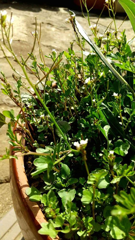 タネツケバナ、ガザニアさんの鉢に同居中、😉可愛くて、なかなか抜けません😊