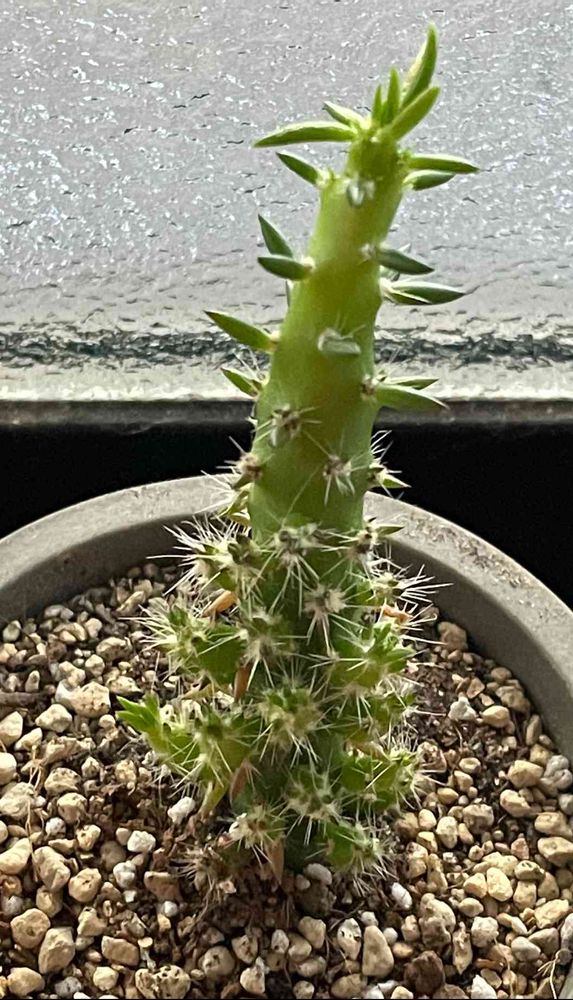 昨日のうちに倒れそうな鉢類は隅へやっていてよかった〜。もうすぐ雨もあがるかな。こんな天気なので今日は室内組のご紹介。サボテンさん。ダイソーシリーズです👍ちょっと曲がってますがまだ真っ直ぐになってきたほうです(笑)
