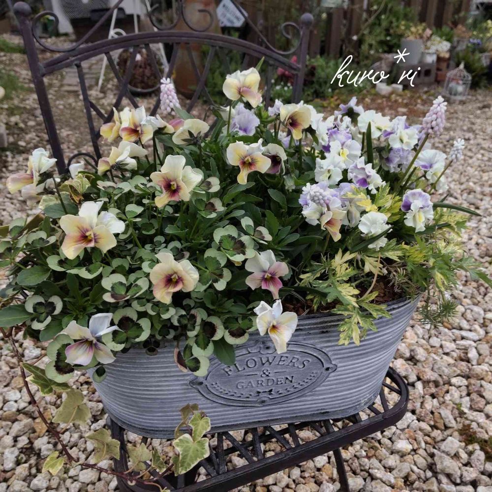 シックな雰囲気に寄せ植えにピンクのムスカリさんが可愛いですね💗