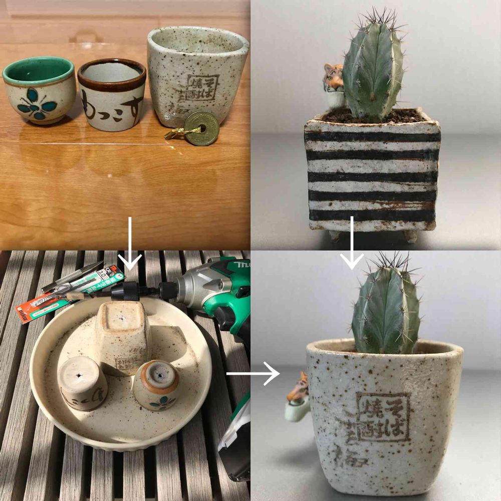 ぐい呑、お猪口類に穴開けて、雲海のぐい呑が深さもピッタリだったので植え替えました‼️