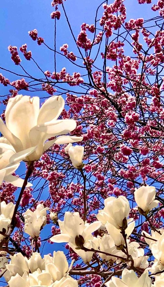 初めてです!ハクモクレンとのコントラストが綺麗です✨🤍✨💗✨🤍✨💗