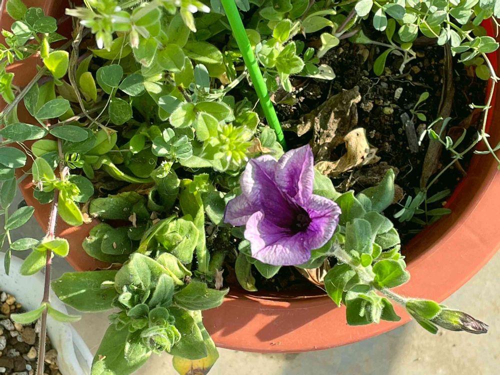 令和4年3月27日(日)晴れ☀️ おはよー^_^ございます 昨夜は雨音 凄かったねー🪴🪴🪴大丈夫だったかな?1月 姿を消したサフィニア?が零れ種から咲きました🌸(雑草カラスノエンドウも中々かわいい💕)