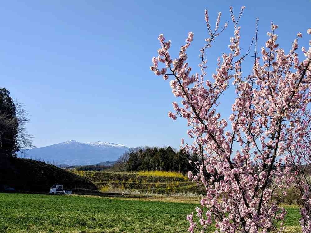 梅が満開。遠くの山には、まだ残雪。