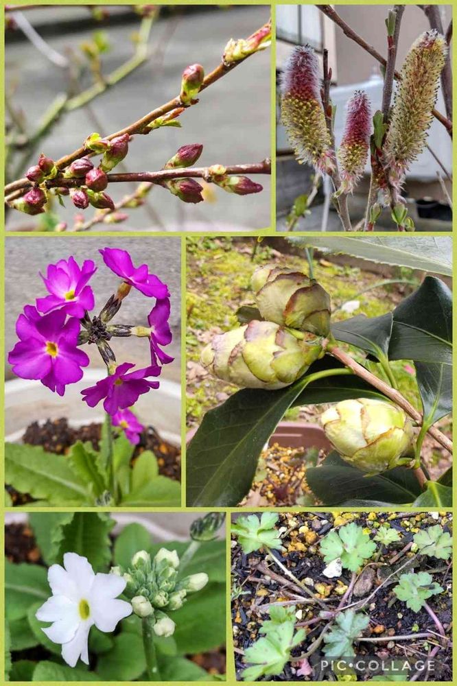 ピンク、白は「玉咲きサクラソウ」。今朝、紫の花も見え始めました💜💕