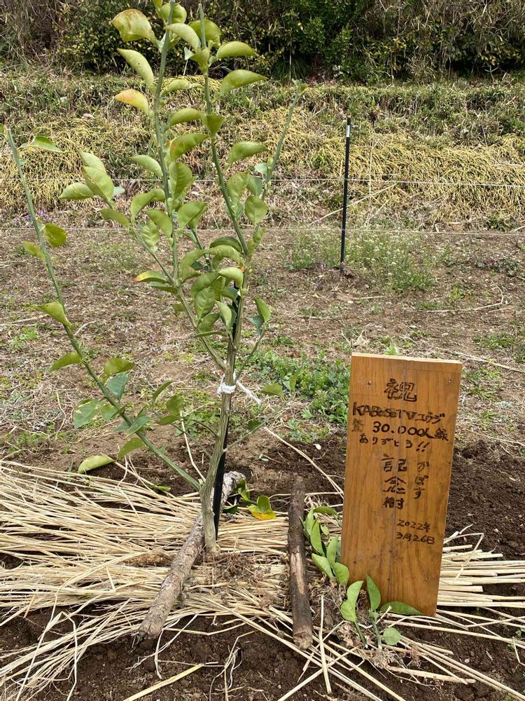 達成記念に、かぼす植樹に看板🪧を付けました。