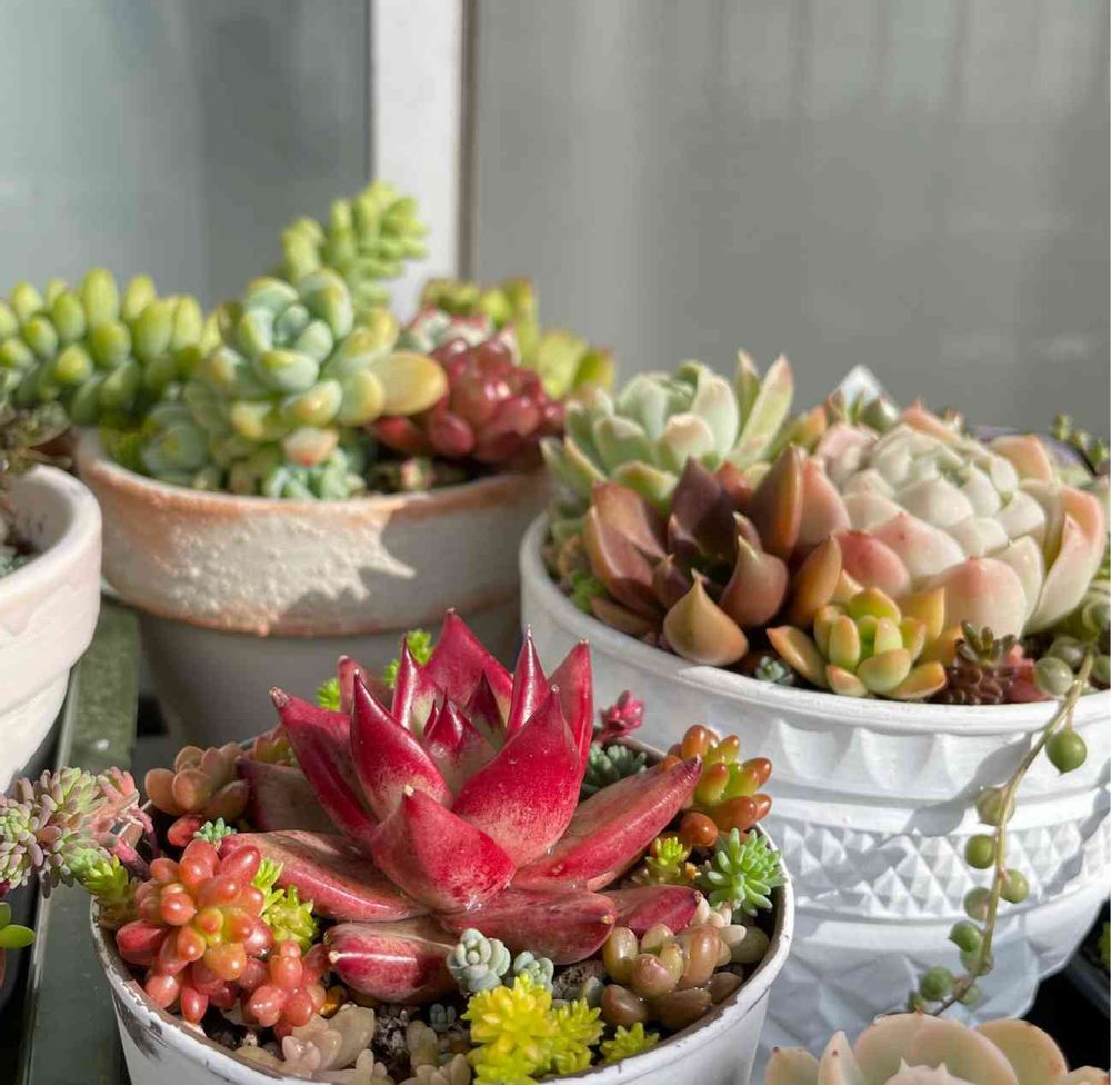 朝日でキラキラの多肉達、ロメオ(だったはず)がとっても良い色です🥰