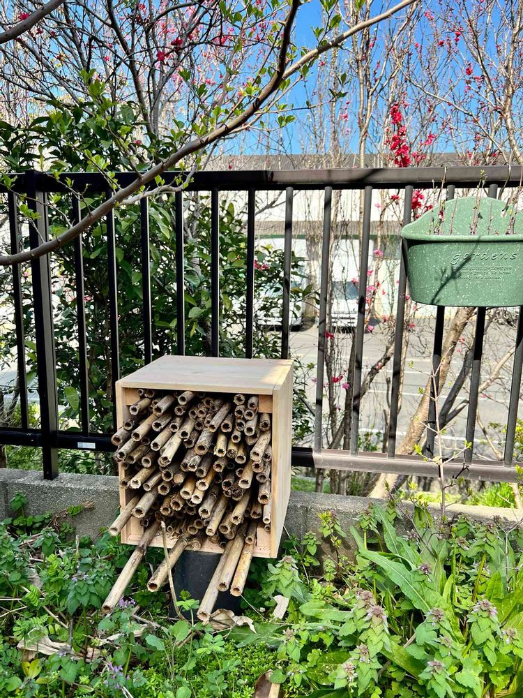 以前から蜂宿は設置していたんですが、拡張して、箱に入れて、観察しやすい場所にリニューアルしました。どんなゲストが来るか、楽しみです。冬場はテントウムシやカメムシのシェルターにもなりそうです。