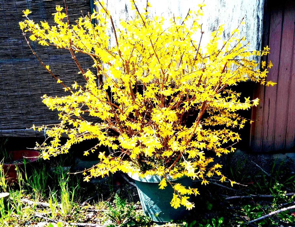通り道のお宅の表に、鉢代わりのバケツで、レンギョウが満開です。
