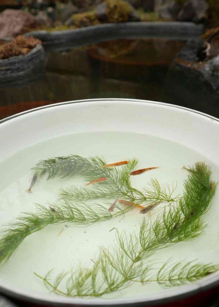 プラ池には越冬した改良メダカ達を、こちらも水合わせの儀を行なった後放しました♪
